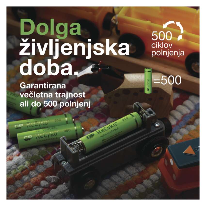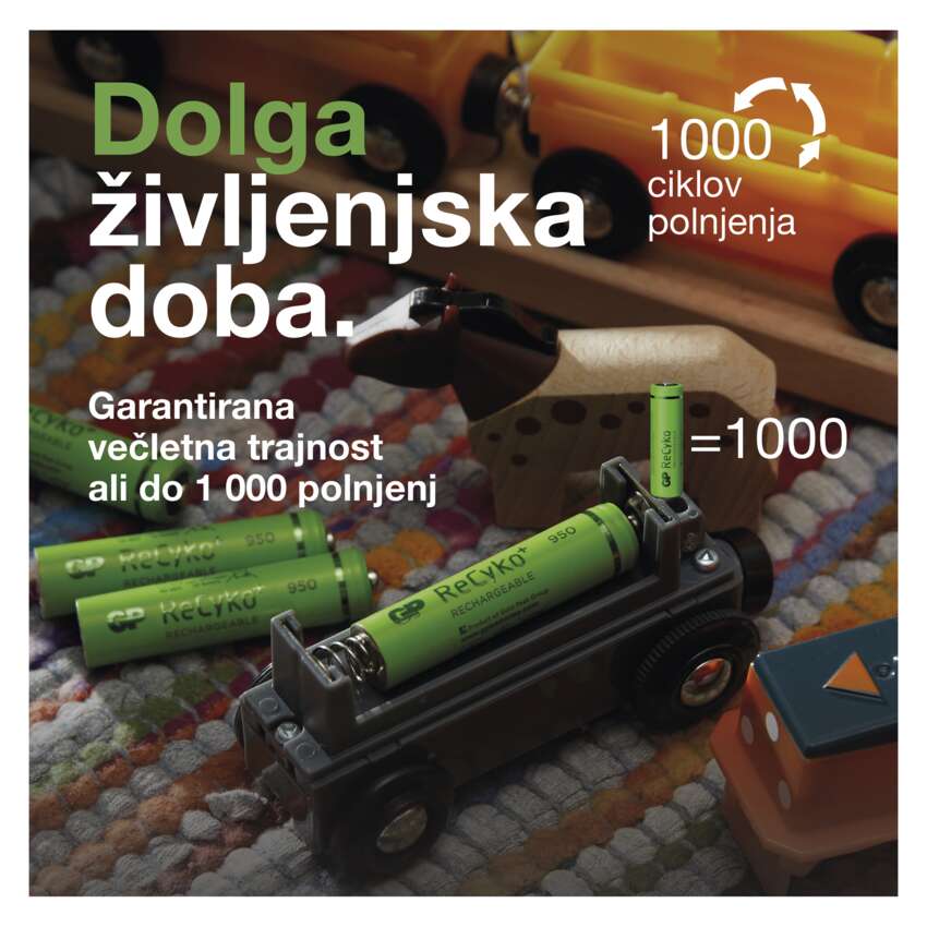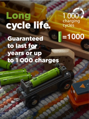 Uporaba akumulatorskih baterij GP ReCyko je priročna, okolju prijazna in stroškovno učinkovita. Dejansko bodo baterije delovale več let, ne da bi se zmanjšala njihova zmogljivost. Tudi po 1.000 polnjenjih in praznjenjih ohranijo večino svoje zmogljivosti. V primerjavi z enakovrednim trajanjem baterij za enkratno uporabo boste prihranili precej denarja.