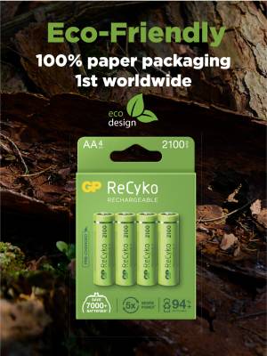 Baterije ReCyko poleg tega, da so popolnoma zanesljive, navdušujejo tudi s svojim minimalnim ekološkim odtisom. To je zato, ker so baterije GP ReCyko izdelane tako, da so okolju prijazne. Že v proizvodnem procesu se uporabljajo reciklirani viri. Tudi večino materialov, iz katerih so izdelane baterije, je mogoče reciklirati. Poleg tega je družba GP razmišljala tudi o ekološko prijazni papirnati embalaži. Zaradi tega so baterije GP odličen izdelek za tiste, ki jim je mar za okolje.