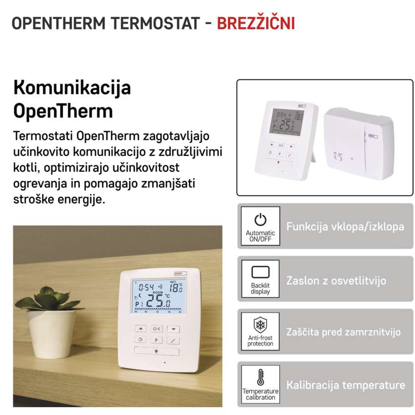 OpenTherm je ime za obliko dvosmerne komunikacije med modulom kotla in termostatom. Termostat prejme potrebne informacije, ki jih nato obdela in posreduje nazaj kotlu, ki uravnava temperaturo vode na najučinkovitejšo raven. Zahvaljujoč informacijam, zbranim od termostata OpenTherm, je moč kotla modulirana, kar omogoča neprekinjeno dodajanje in odvzemanje moči glede na želene in izmerjene vrednosti. Prednost tega je, da se moč kotla ne uravnava le glede na sobno temperaturo, temveč tudi glede na temperaturo vode v sistemu in druge spremenljivke. V nasprotju s tem običajni termostat ON/OFF preklopi kotel na 100-odstotno ali 0-odstotno moč. OpenTherm tako poveča učinkovitost ogrevalnega sistema, zmanjša stroške (račune za energijo) in podaljša življenjsko dobo kotla.