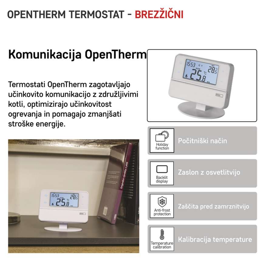 OpenTherm je ime za obliko dvosmerne komunikacije med modulom kotla in termostatom. Termostat prejme potrebne informacije, ki jih nato obdela in posreduje nazaj kotlu, ki uravnava temperaturo vode na najučinkovitejšo raven. Zahvaljujoč informacijam, zbranim od termostata OpenTherm, je moč kotla modulirana, kar omogoča neprekinjeno dodajanje in odvzemanje moči glede na želene in izmerjene vrednosti. Prednost tega je, da se moč kotla ne uravnava le glede na sobno temperaturo, temveč tudi glede na temperaturo vode v sistemu in druge spremenljivke. V nasprotju s tem običajni termostat ON/OFF preklopi kotel na 100-odstotno ali 0-odstotno moč. OpenTherm tako poveča učinkovitost ogrevalnega sistema, zmanjša stroške (račune za energijo) in podaljša življenjsko dobo kotla.
