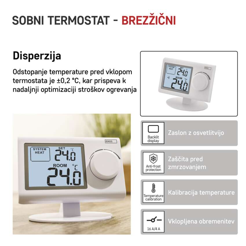 Imejte temperaturo in stroške ogrevanja ter hlajenja pod nadzorom. Brezžični sobni termostat uravnava ogrevalni sistem in klimatsko napravo ter nadzoruje idealno temperaturo namesto vas – v stanovanju, hiši ali pisarni. Omogoča nastavitev temperature od 5 °C do 35 °C in zagotavlja prijetno temperaturo poleti in pozimi. Po zaslugi brezžične izvedbe in dosegu do 100 m omogoča spremembo referenčnega prostora po potrebi. Prednost je pregleden osvetljen zaslon z velikimi številkami, na katerem poleg nastavljene temperature odčitate tudi trenutno temperaturo v sobi na lestvici od 0 °C vse do 40 °C. Enostavno in intuitivno upravljanje s pomočjo vrtljivega gumba premore enostavno cela družina.