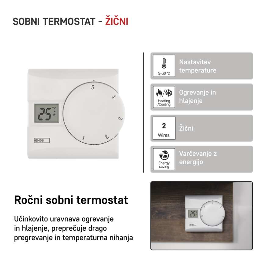 Termostat bo vaša desna roka vse leto zaradi možnosti priključitve na sistem ogrevanja in klimatizacijo. Ročni termostat zanesljivo zagotavlja optimalno temperaturo v mrzlih zimskih mesecih in poletni vročini.Izognite se temperaturnim šokom, ki niso dobri za vaše zdravje in družinski proračun.