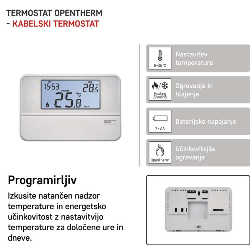 Uživajte v udobju in popolnem nadzoru nad vašim ogrevalnim sistemom ter hkrati prihranite čas in stroške. Prednost žičnega termostata je stabilna in zanesljiva povezava s kotlom, kar omogoča nemoten prenos informacij. Osvetljen zaslon zagotavlja enostavno upravljanje, termostat pa omogoča programiranje do 6 temperaturnih sprememb na dan. Temperaturo lahko nastavite med 5 °C in 35 °C, kar omogoča natančno prilagajanje vašemu udobju. Odlikuje ga možnost priklopa na kotel, ki podpira komunikacijski protokol OpenTherm, pa tudi običajni relejski vklop. Z uporabnimi funkcijama Zamek in Počitnice boste imeli popoln nadzor nad ogrevanjem svojega doma ali pisarne – tudi v vaši odsotnosti.