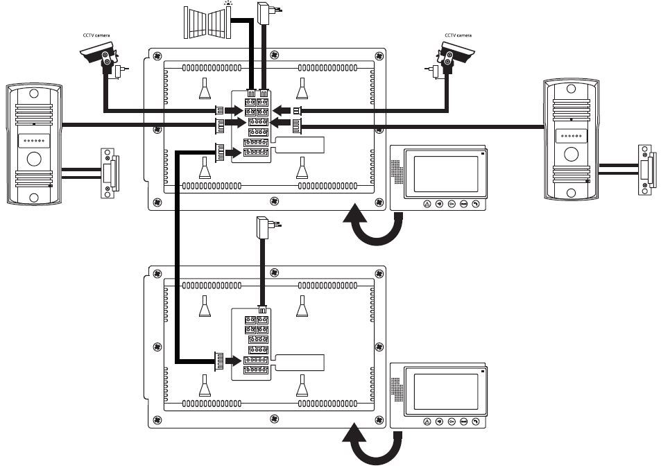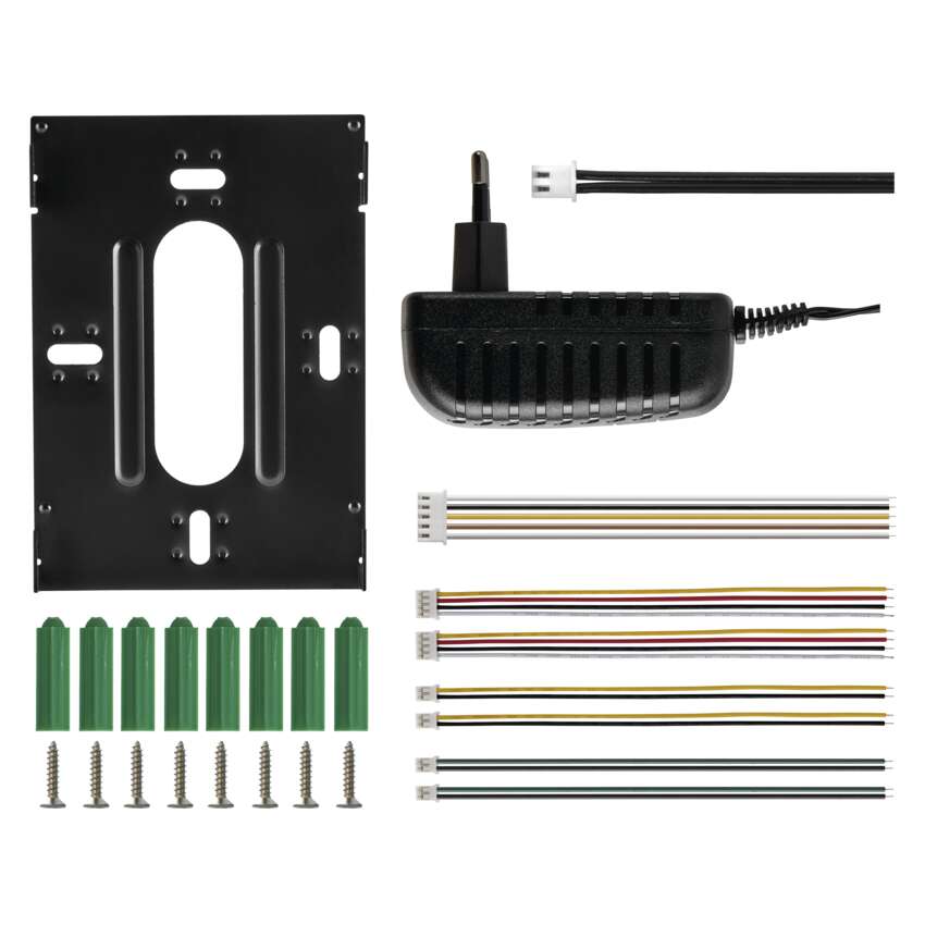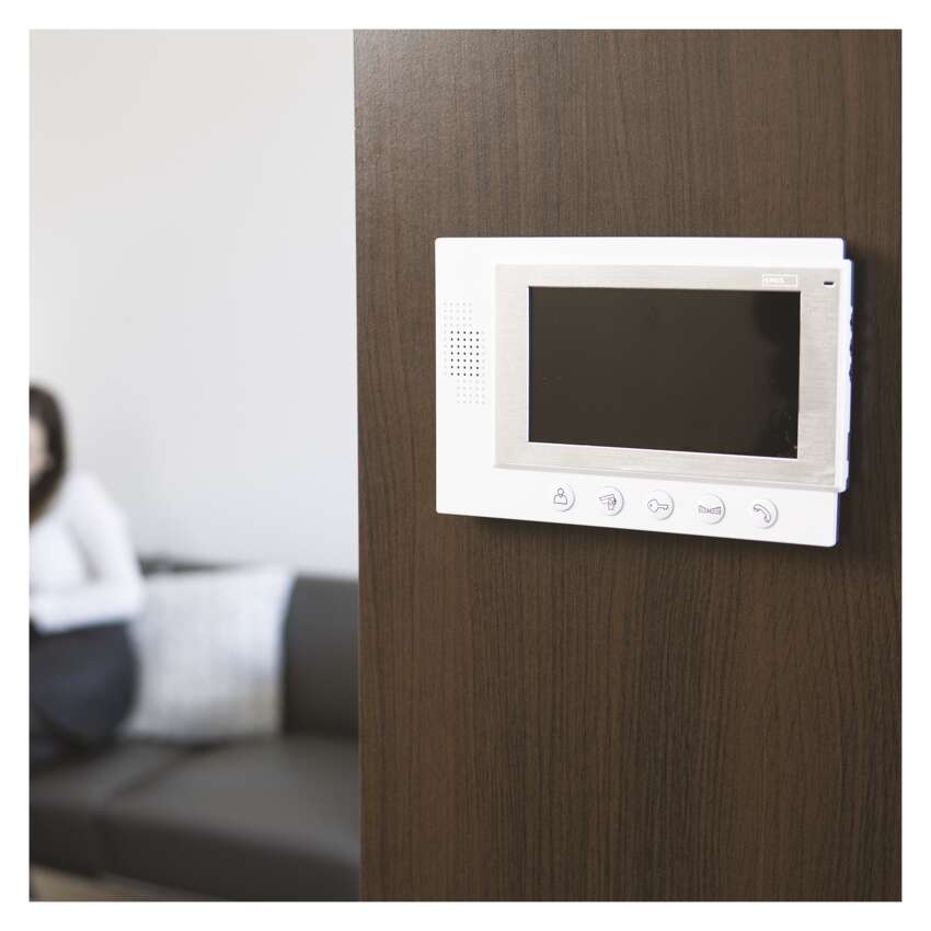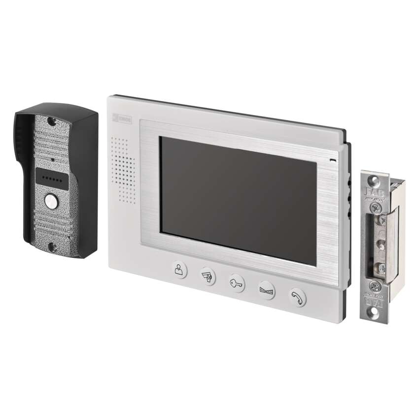 Enostaven set videodomofona. Slika se prikazuje na velikem, 7" barvnem LCD zaslonu. Naprava se napaja s pomočjo priloženega 12 V adapterja. Naprava omogoča upravljanje ključavnice vrat in pomika vrat.