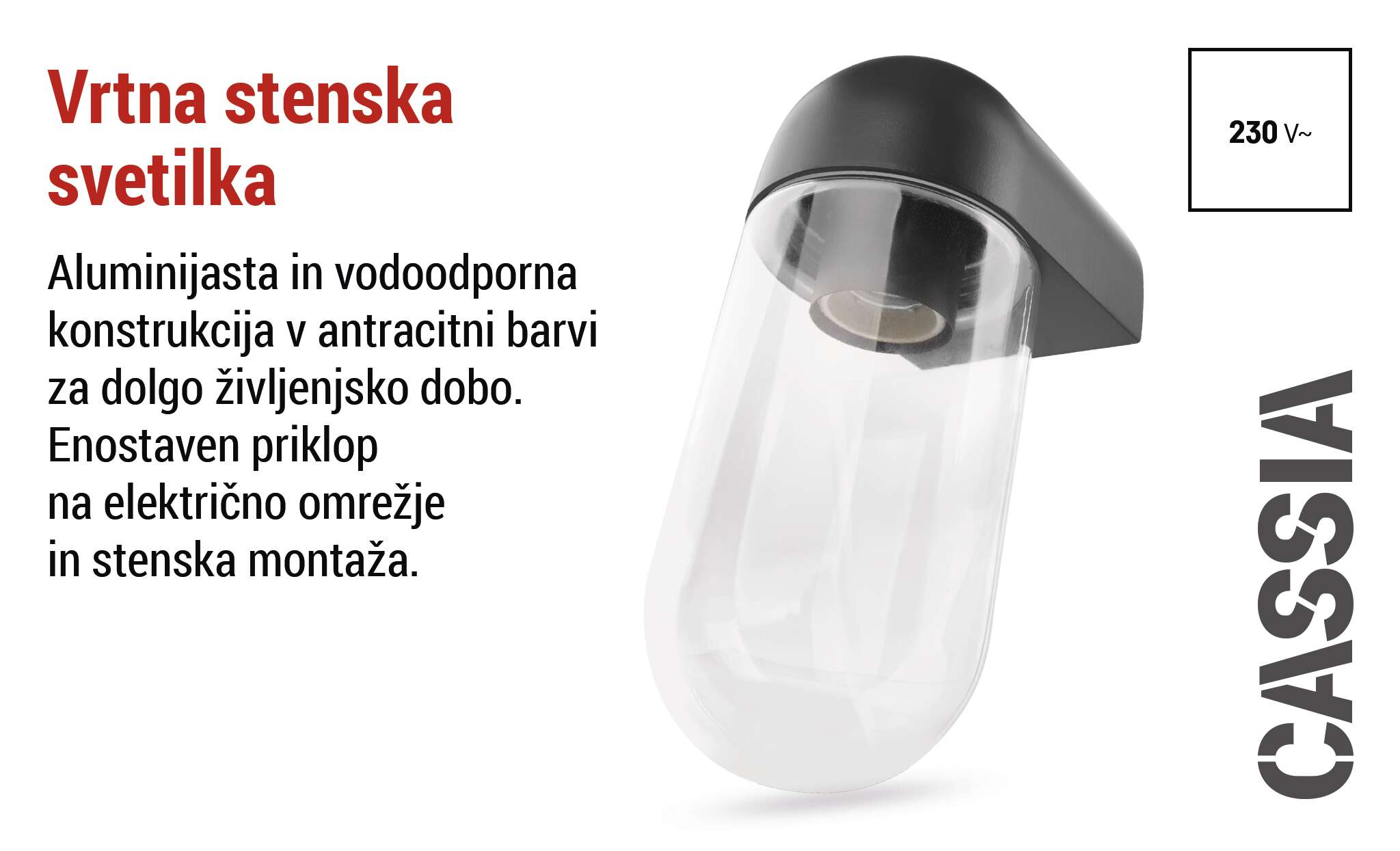 Stenska svetilka CASSIA združuje elegantno oblikovanje in visokokakovostno osvetlitev, zato je popoln dodatek za vsak zunanji prostor. Zaradi natančne izdelave in trpežnih materialov zagotavlja zanesljivo delovanje v vseh razmerah.
