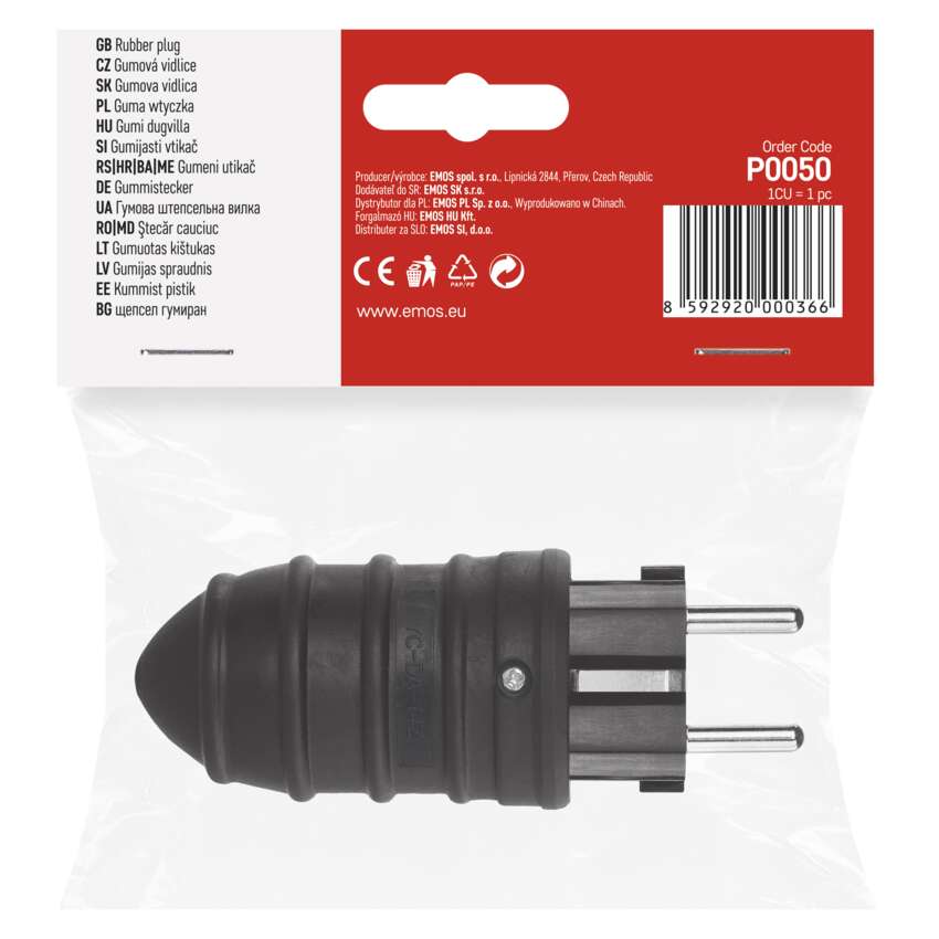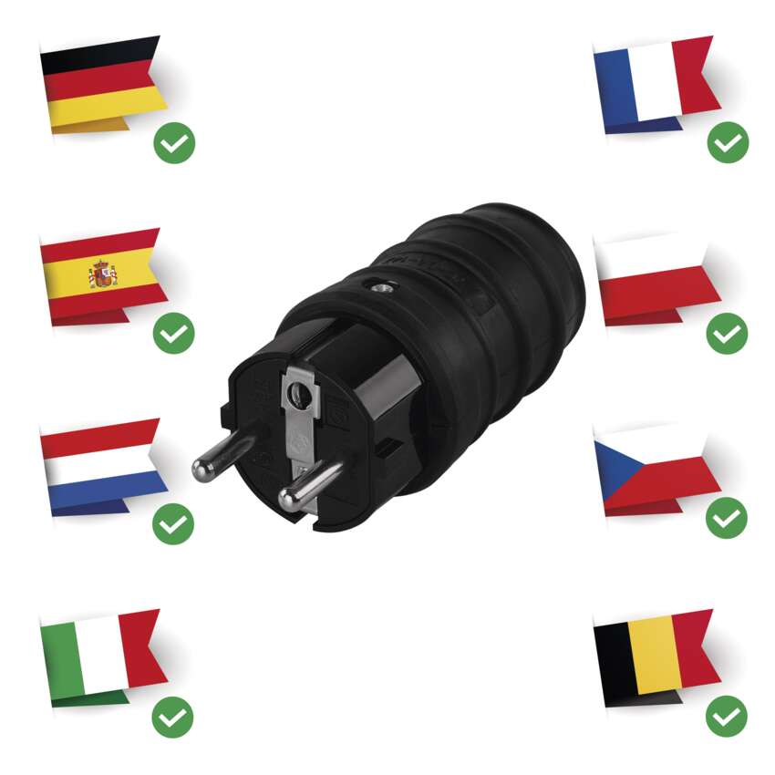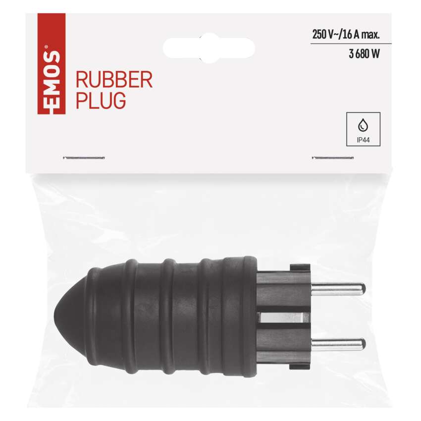 Gumen vtikač za fleksibilen podaljšek. Namenjen za priključitev električnih naprav, kjer se zahteva višja stopnja zaščite (tudi na prostem).